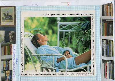 Trop grand - que dis-je ? - étonnamment long et donc n'entrant pas en totalité dans mon scanneur. Merci Sab, c'est superbe ! Les rubans, l'ambiance merveilleuse de cette superbe pièce emplie de la lumière provenant du jardin ; une jolie table ronde invitant à une petite tasse de café devant des tartelettes. Tu ne le savais pas, mais j'ai occupé (years ago...) un appartement avec des portes intérieures à boiseries et petites vitres comme sur ton art postal, et j'avais tout peint en ... rose bonbon (vieux rose) : radiateurs, boiseries allant jusqu'à réaliser en couture une housse de couette et ses taies d'oreillers dans un tissu merveilleux aux teintes dominantes de rose. J'ai l'impression de retrouver ces pièces en enfilade... Une échelle, une bibliothèque, des rubans et un clair-obscur de Georges de la Tour (de Vic-sur-Seille, Moselle - diocèse de Metz et ancien duché de Lorraine). Tout n'est que merveilles.