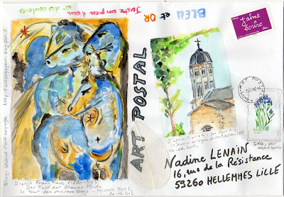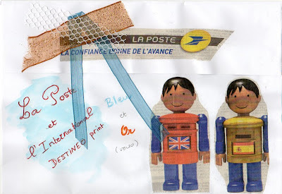 Allez, je retente ma chance : je poste un mail art tout à l'heure en direction de Hellemmes, pour mon amie Nadine qui aime tant le bleu. J'espère que cela lui plaira. Comme La Poste fait de la pub pour la confiance, je relève le défi : s'ils sont fiables à l'international, encore plus doivent-ils l'être sur le plan national. Allez, ce n'est pas si loin que cela entre Nancy et Lille !