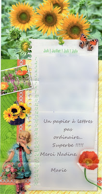 Bien entendu Nadine, et contrairement à tes craintes, JE NE SUIS PAS déçue - comment le serais-je ? - et j'aime énormément. Enormément également cette page de calendrier "Tournesols de Juillet" que tu as utilisée de façon très originale en tant que papier à lettres. Bravo pour tout et merci. Quant à l'expo des oeuvres de François Dreulle, elle me paraît très intéressante et c'est pourquoi j'en publie l'article que tu m'as envoyé.