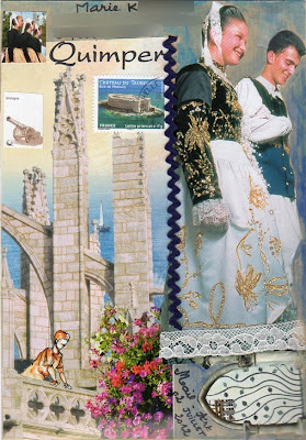 Ca commence comme un conte... Madame à la tour monte... pour guetter l'arrivée de son preux chevalier ? Un magnifique art postal de Nadine Lenain (mamymail.over-blog). De la dentelle et du feston, de l'or surajouté sur la robe de la jeune bretonne, un décor d'histoire et aussi de folklore, la mer et ses bateaux, un pêcheur fructueux, un porte-bonheur aussi... et une fort jolie aquarelle : merci Nadine !