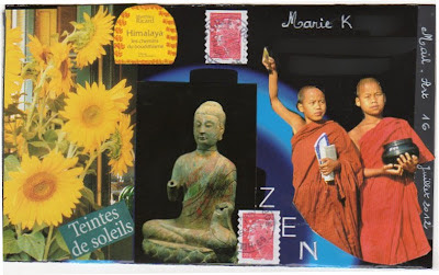 En vert et rouge, sans oublier le bleu que Nadine aime tant et un motif à l'aquarelle sur son thème de prédilection qui est le Japon. Bien entendu, jours fériés obligent, ce mail art ne partira que lundi prochain.